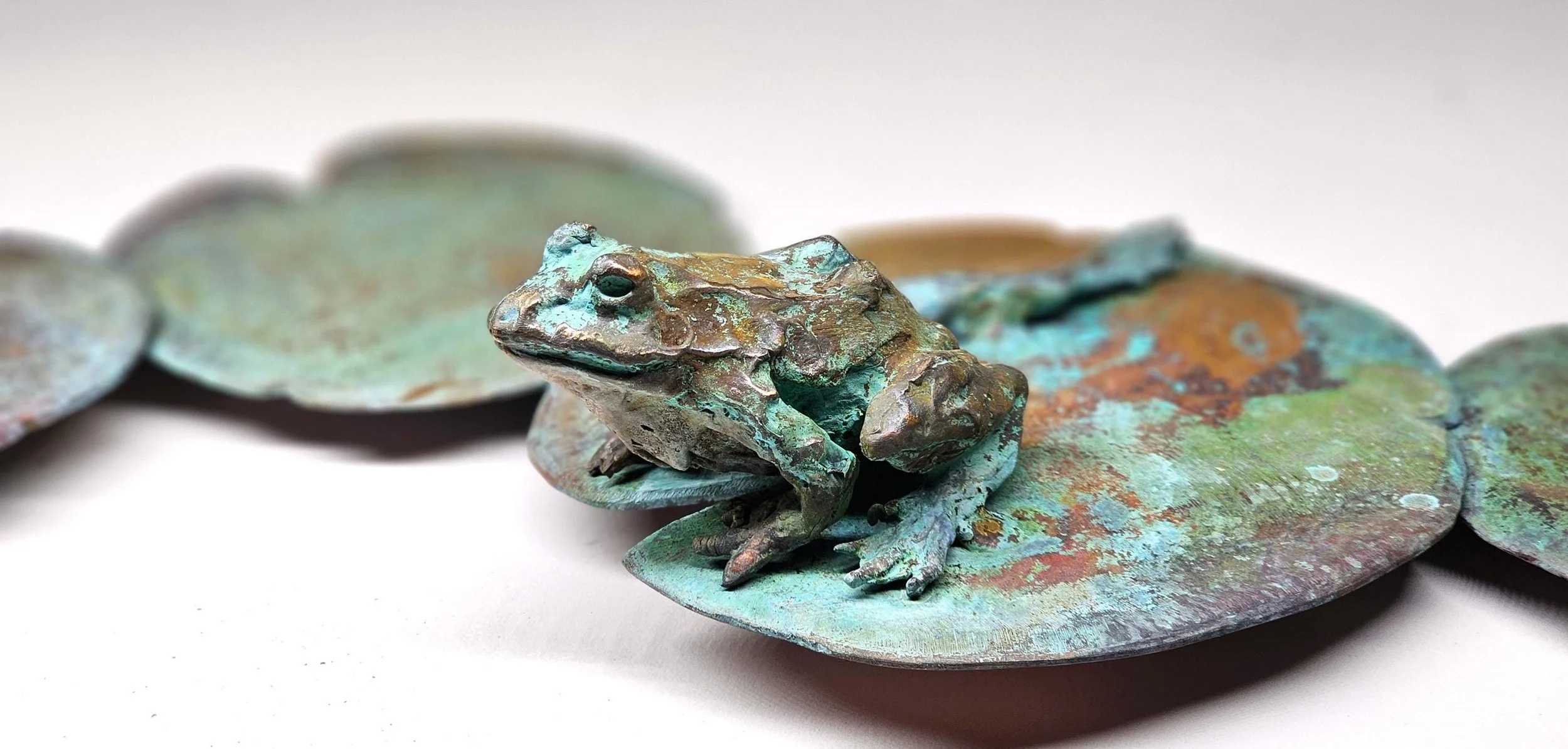 Most of my sculptures and birdbaths feature patinas that are applied chemically, not left to develop naturally over decades. I use traditional techniques to create rich colors—blues, greens, purples, yellows, and more—that mimic the organic aging of copper, bronze, and brass. These effects are part of what makes each piece a living work of art, suitable for both outdoor environments and interior spaces.